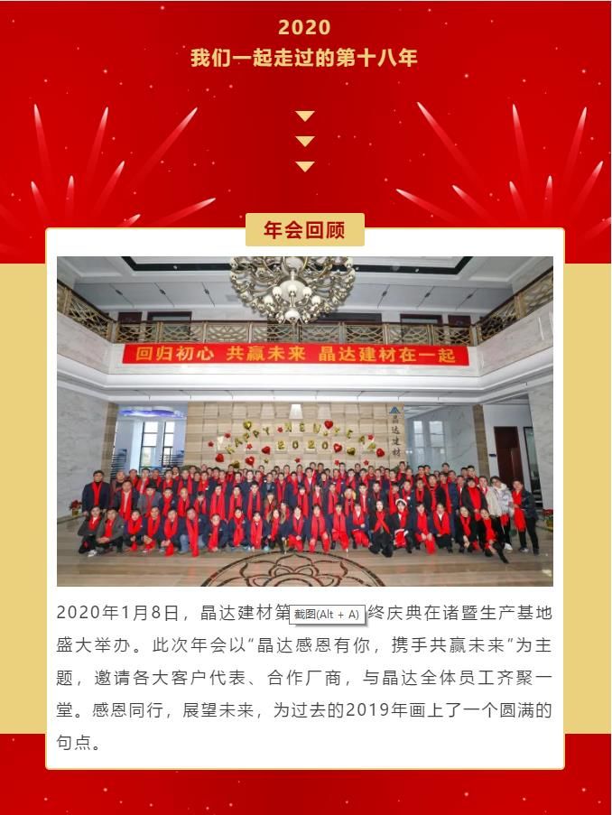 2020年1月8日,晶達建材第十八屆年終慶典在諸暨生產基地盛大舉辦。此次年會以“晶達感恩有你,攜手共贏未來”為主題,邀請各大客戶代表、合作廠商,與晶達全體員工齊聚一堂。感恩同行,展望未來,為過去的2019年畫上了一個圓滿的句點。
